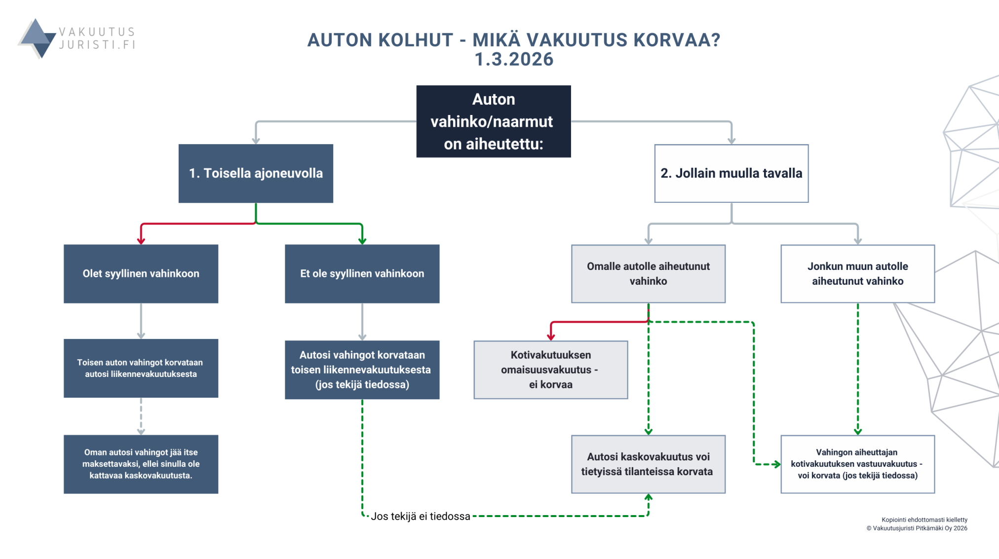 Koska korvauksien saamiseen vaikuttaa se, kenen autoa on kolhittu ja millä tavalla kolhu on aiheutettu, kasasin alle kaavion siitä, mistä ja miten korvauksia voi eri tilanteissa saada.
